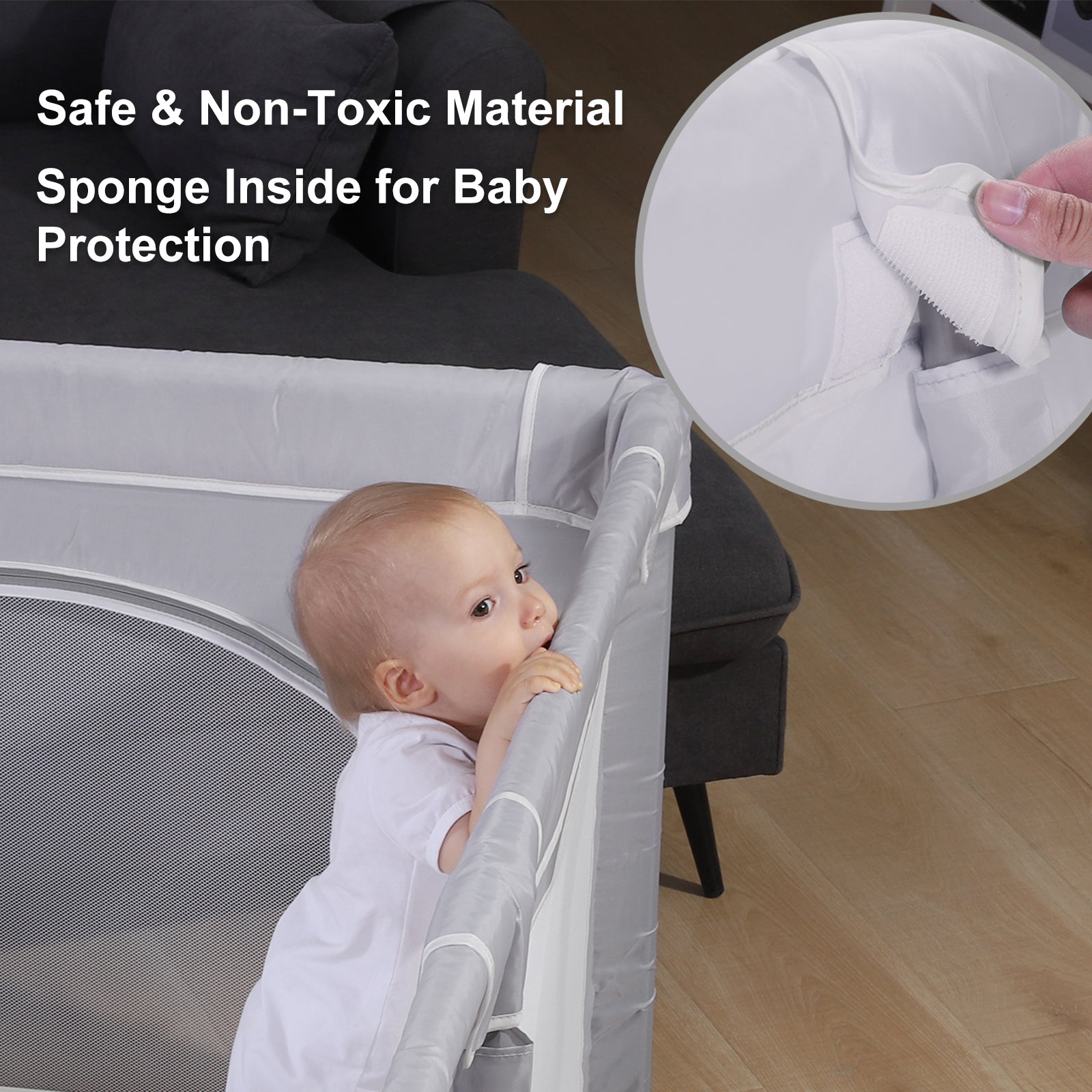 💕【Exclusive Sponge Protection& Anti-Fall Design 】Made of qualified Waterproof Oxford material. On the top and the side of the playpen, it designes with double layer oxford and patented sponge between the material for kids protection. All stainless steel pipes are covered with thick Oxford cloth, and it can prevent your baby from getting hurt. Suction cups under the play yard make the playpen sturdy and non-slip.